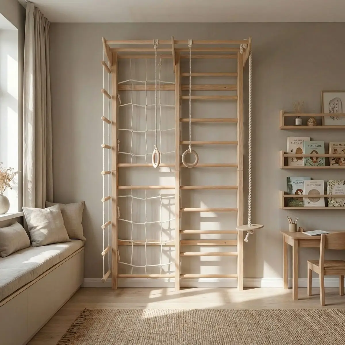 Das widerstandsfähige Buchenholz verleiht der Kletterwand aus Holz ihre beeindruckende Belastbarkeit von bis zu 150 kg, während Kiefernholz für den hellen, harmonischen Look sorgt, der perfekt in jedes Kinderzimmer passt. Beide Holzarten bleiben bewusst unbehandelt, um die natürliche Maserung und den authentischen Charakter des Holzes zu bewahren – für eine nachhaltige, sichere und langlebige Sprossenwand für Kinder.